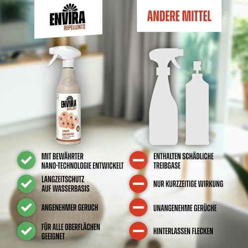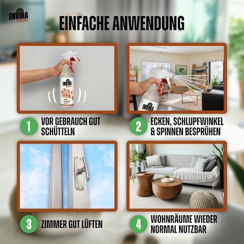 Das Envira Spray zeigt seine Stärke besonders in schwer zugänglichen Bereichen. Ecken, Ritzen oder Räume unter Möbeln werden besonders effektiv behandelt, sodass Sie gezielt gegen Spinnen vorgehen können, wo sie sich häufig aufhalten.