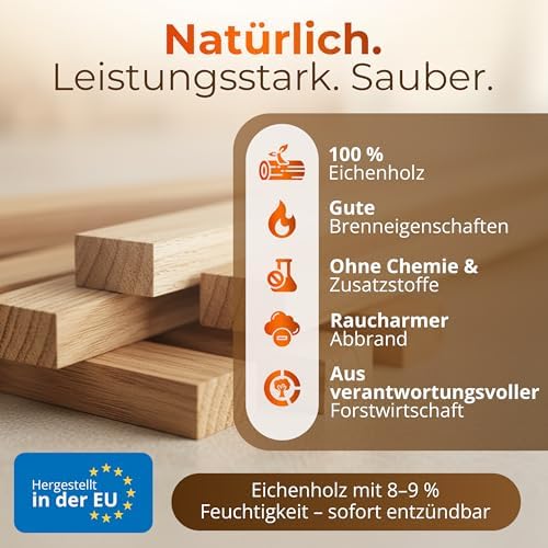 • 100% natürliches Eichenholz: Unser Zündholz sorgt für ein schadstofffreies und angenehm duftendes Feuer ohne chemische Gerüche.