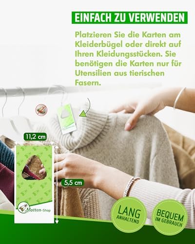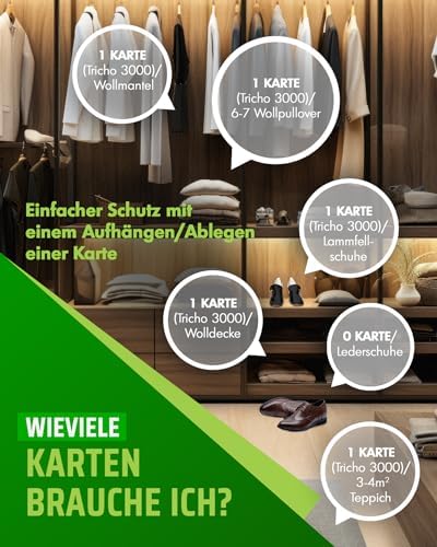 Die Kärtchen sind ausreichend für eine Schrankbreite von 2-3 Metern oder für eine Fläche von bis zu 40 Quadratmetern auf Ihrem Teppich. Dies macht sie zu einer idealen Wahl für Apartments, größere Wohnungen oder Häuser – überall dort, wo Textilien sicher aufbewahrt werden müssen.