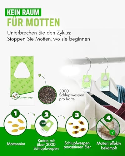 Mit unseren Schlupfwespen-Kärtchen gegen Kleidermotten im Doppelpack investieren Sie in einen sicheren und umweltfreundlichen Schutz für Ihre Kleidung und Textilien. Schützen Sie Ihre wertvollen Stücke und genießen Sie die Ruhe, die ein mottenfreies Zuhause mit sich bringt. Ordern Sie jetzt und befreien Sie sich von der Sorge um Kleidermotten!