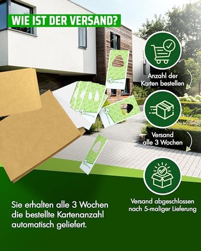 Profitieren Sie von einer kontinuierlichen Bekämpfung der Mottenplage: Wir liefern Ihnen insgesamt 6 Lieferungen mit einem Abstand von jeweils 3 Wochen, die jeweils 8 Kärtchen enthalten. Dieses durchdachte System sorgt dafür, dass die Schlupfwespen stets aktiv sind und sich reproduzieren, wodurch Ihr Zuhause über einen längeren Zeitraum hinweg frei von Kleidermotten bleibt.