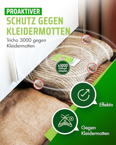 Egal ob im Kleiderschrank oder auf dem Teppich – mit unseren Schlupfwespen-Kärtchen bieten wir Ihnen eine innovative Lösung zur Bekämpfung von Kleidermotten. Unser Doppelpack beinhaltet zwei Kärtchen, die garantiert mindestens 3000 Eier pro Kärtchen liefern. So sind Sie bestens ausgestattet, um Ihre Kleidung und Textilien effektiv zu schützen.