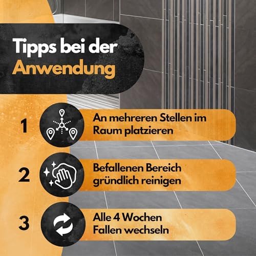Um die Wirksamkeit der Silberfisch Falle zu maximieren, empfehlen wir, sie an mehreren Stellen im Raum zu platzieren. Achten Sie darauf, den befallenen Bereich gründlich zu reinigen, um die Schädlinge gezielt zu fangen. Wechseln Sie die Fallen alle 4 Wochen aus, um eine kontinuierliche Überwachung zu gewährleisten und einen befriedigenden Einsatz zu garantieren.