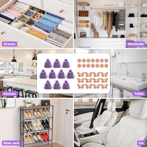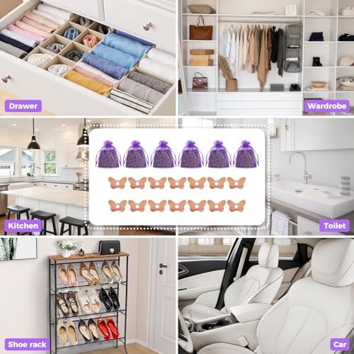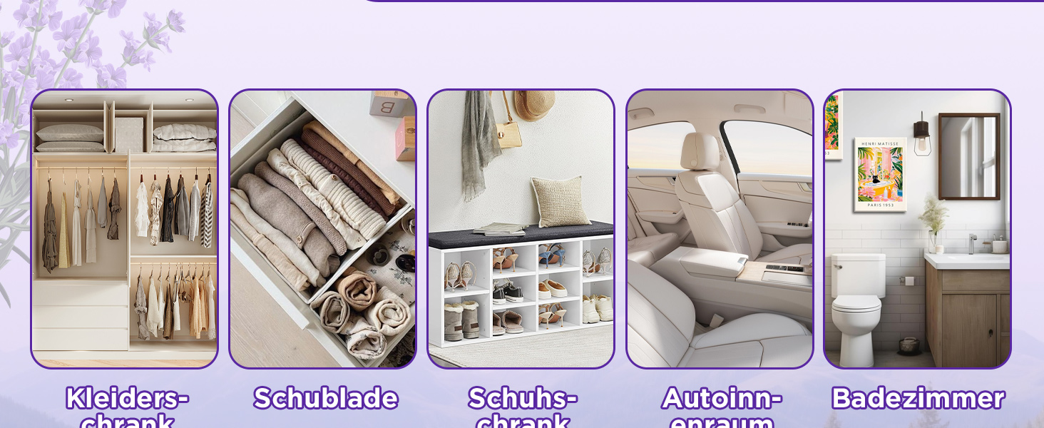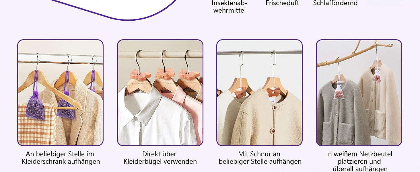 Unsere Lavendelbeutel und Zedernringe sind nicht nur im Kleiderschrank nützlich, sondern finden auch Verwendung in Schuhschränken, Autos, Kissen oder Aufbewahrungsboxen. Sie können die Produkte ganz nach Belieben im gesamten Haus aufhängen, um überall ein frisches, angenehmes Aroma zu verbreiten.
