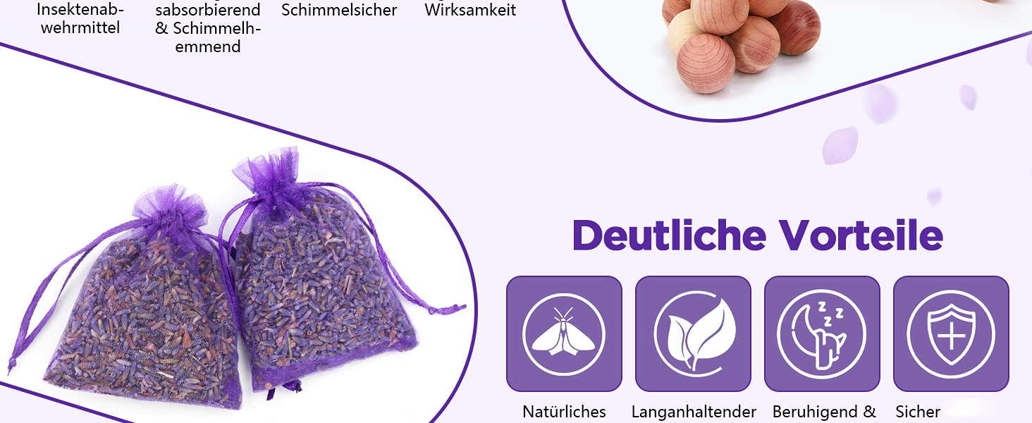 Holen Sie sich jetzt dieses vielseitige Set und genießen Sie die Vorteile von natürlichem Motten- und Geruchsschutz sowie einer frischen Raumluft!
