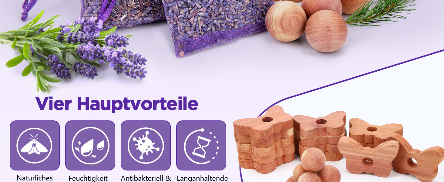 Dank der natürlichen Eigenschaften von Lavendel und Zedernholz bieten unsere Produkte eine effektive Lösung gegen Kleider- und Vorratsmotten. Sie eignen sich hervorragend zum Schutz Ihrer Kleiderschränke, Schubladen und Koffer. Die Kombination aus frischem Zedernholz und Lavendelduft ist eine bewährte Methode, um unliebsame Schädlinge fernzuhalten und Ihre Kleidungsstücke frisch zu halten.